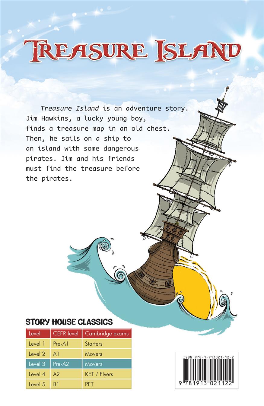 Treasure Island is an adventure story. Jim Hawkins, a lucky young boy, finds a treasure map in an old chest. Then, he sails on a ship to an island with some dangerous pirates. Jim and his friends must find the treasure before the pirates.